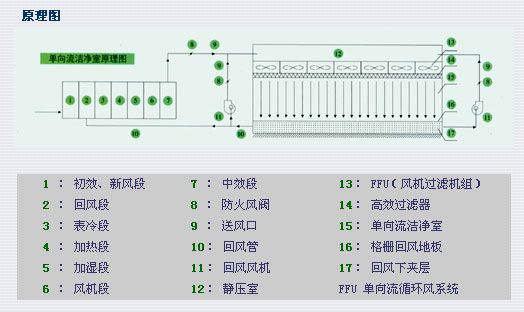 ·单向流洁净室(1-100级) 1-100 级的洁净室,均采用单向流的气流组织送风方式,即洁净室内的气流在同一截面的任意一点,气流的方向和速度均保持一致,这样可以使清洁空气象“活塞”一样,将室内的尘埃粒子以最快的速度带走。要实现“活塞”的效果,高效过滤器需要布满屋顶才可实现单向流的气流组织方式。