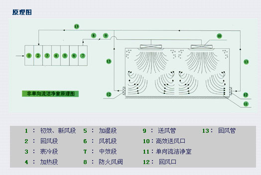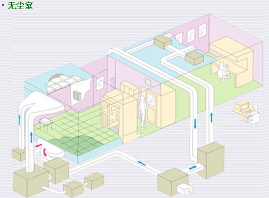 ·非单向流洁净室(1000-10万级) 1000-10 万级洁净室的气流组织方向和100 级以上的洁净室不同,室内的气流是以不均匀的速度呈不平行流动的,伴有回流或涡流,它主要靠洁净的气流不断稀释室内空气,将室内的污染逐渐排出,来实现净化。不同的净化等级,主要是依靠单位时间内所送风量的不同来实现的。